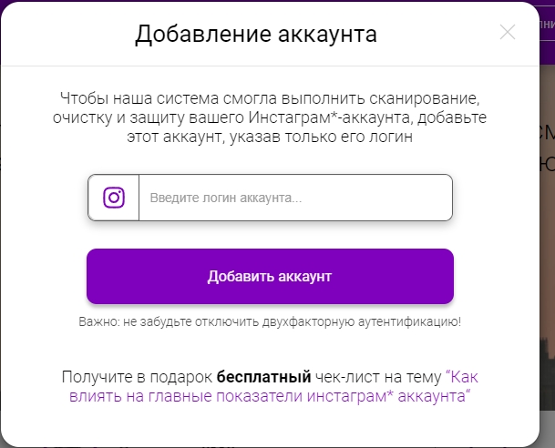 Прежде всего вам необходимо добавить ваш Инстаграм* аккаунт. Введите логин и пароль от аккаунта и нажмите кнопку "Добавить аккаунт"
