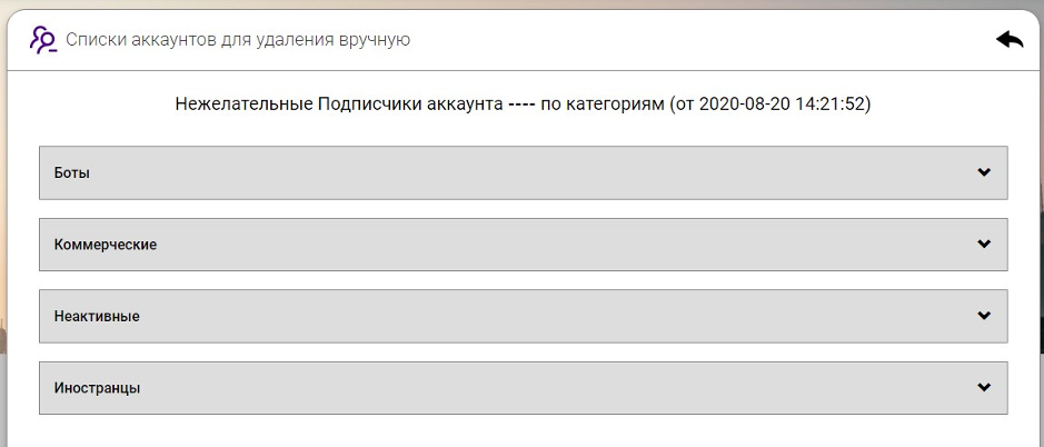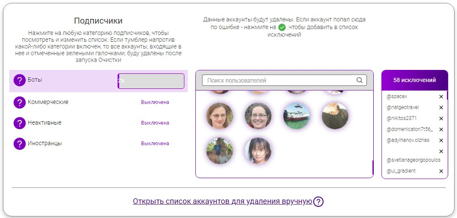 На этапе очистки вы можете открыть Список обнаруженных угроз для ручной очистки. Для этого нажмите на строку “Открыть список аккаунтов для удаления вручную”. Тогда вы попадёте в раздел, где сможете самостоятельно пройти по обнаруженным угрозам и отписаться от них в ручном режиме.