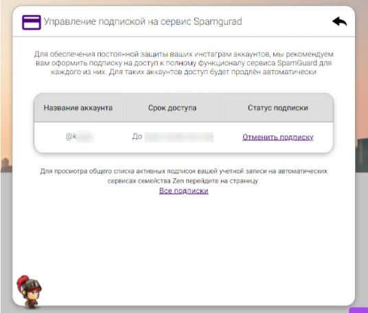 В открывшемся модальном окне нажмите на ссылку Управление подпиской. На странице Управление подпиской вы можете перейти к отмене текущей подписки для каждого добавленного аккаунта.